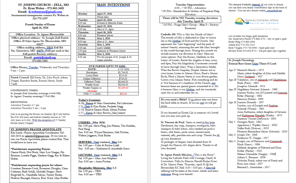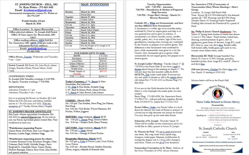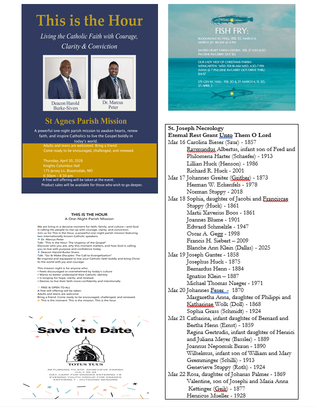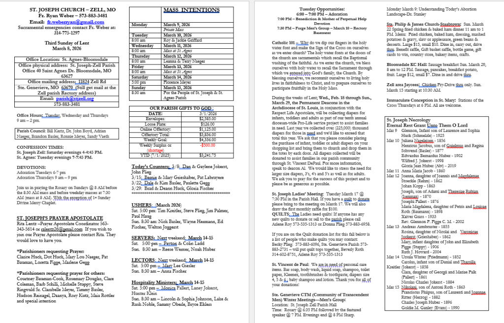 Welcome to St. Joseph Catholic Church in Zell, MO. For 175 years, we have sought to give God glory and to seek eternal life. While I hope your visit to this website gives you some starting information about our parish, I hope even more that you’ll stop by for a visit. If you’re new to the area, please reach out to me so that I can welcome you in person. If you have a question about your relationship with Our Lord or don’t know what next step to take, reach out, and I’ll be happy to walk with you in your journey.